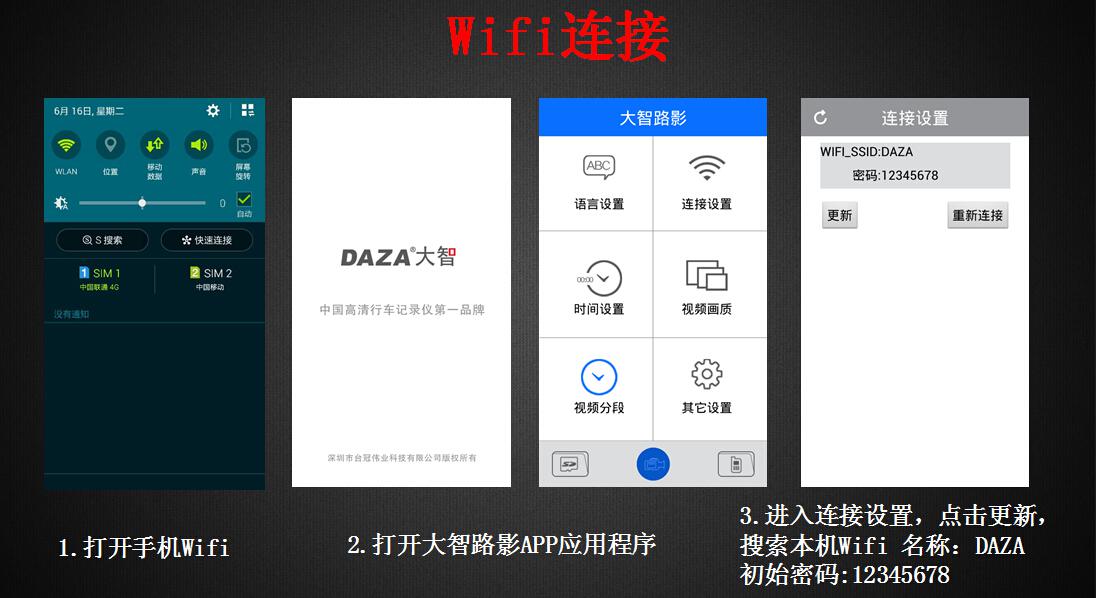 利用手機(jī)APP應(yīng)用程序,使手機(jī)和行車記錄儀通過(guò)WiFi無(wú)線聯(lián)接,可以隨時(shí)顯示回放下載行車記錄視頻。