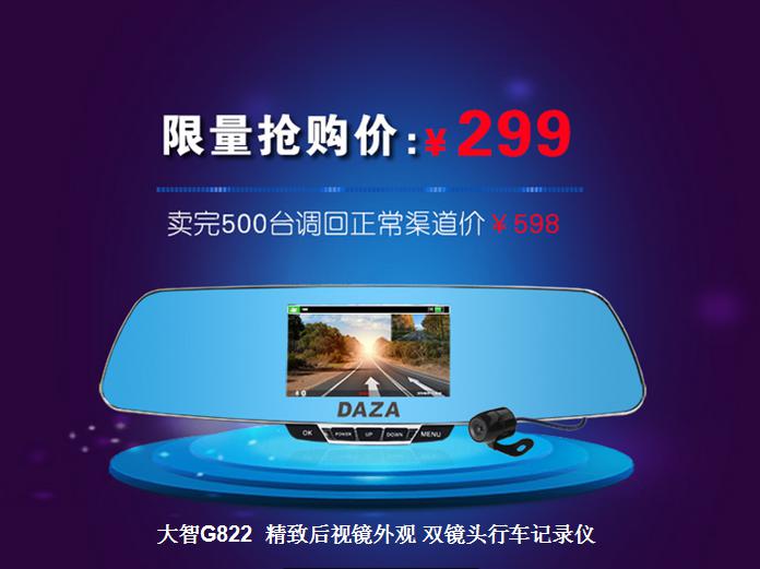 大智G822后視鏡行車記錄儀限量搶購價(jià)只需299元,精致后視鏡外觀,前后雙鏡頭全方位記錄駕駛路況、擁有倒車后視,同時(shí)支持24小時(shí)停車監(jiān)控和行車記錄前后畫中畫顯示。